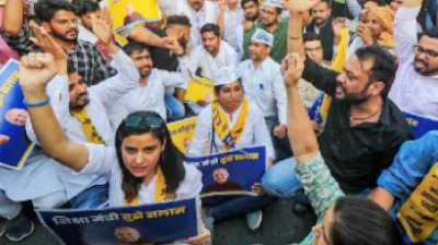 संसद में आप सांसदों का विरोध-प्रदर्शन एलजी को बर्खास्त करने की मांग
