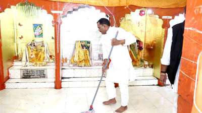 राज्य मंत्री गौर ने मंदिर में लगाया झाडू-पोछा