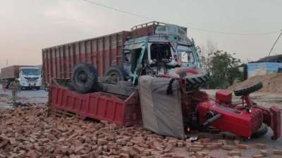 ट्रक ने ट्रैक्टर को मारी टक्कर, युवक फंसा नीचे, भीड़ ने पलट दिया ट्रक