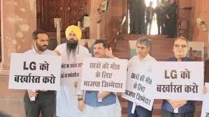 संसद में आप सांसदों का विरोध-प्रदर्शन एलजी को बर्खास्त करने की मांग