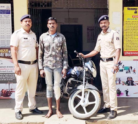बिलासपुर । प्रार्थी सुमित कुमार कैवर्त पिता रामकुमार कैवर्त उम्र 30 वर्ष साकिन निरतू, थाना कोनी, जिला बिलासपुर दिनांक-10/03/2024 को थाना उपस्थित आकर मौखिक रिपोर्ट दर्ज कराया कि रात्रि करीबन 22.00 बजे से 23.55 बजे के मध्य कोई अज्ञात व्यक्ति ग्राम निरतू, स्कुल के पास से इसके मोटर सायकल ॥स्नक्रमांक-ष्टत्र10्रक्त 0132 कीमती 35,000/- रुपये को चोरी कर ले गया है, कि रिपोर्ट पर थाना कोनी में अपराध क्रमांक-90/2024 धारा-379 भादवि पंजीबद्ध कर विवेचना और आरोपी पातासाजी किया गया। चोरी गये मोटर सायकल की पतासाजी की जा रही थी, जो पतासाजी के दौरान मुखबिर से सूचना मिला कि एक व्यक्ति ग्राम निरतू में उक्त मोटर सायकल में घुम रहा है जिसकी गतिविधि संदिग्ध है कि सूचना पर थाना कोनी पुलिस टीम हमराह स्टाफ के रवाना होकर संदेही सरजू श्रीवास उर्फ बटाला पिता रामआश्रित श्रीवास को पकड़कर थाना आया। संदेही का गवाहों के समक्ष पूछताछ कर मेमोरेण्डम कथन लिया गया, जो चोरी करना स्वीकार किये तथा आरोपी सरजू श्रीवास उर्फ बटाला पिता रामआश्रित उम्र 40 वर्ष, निवासी घुटकू बंधवापारा थाना कोनी, जिला बिलासपुर के कब्जे से चोरी गये मोटर सायकल क्रमांक-ष्टत्र10्रक्त 0132 कीमती 35,000/- रुपये को जप्त कर किया गया। आरोपी सरजू श्रीवास उर्फ बटाला पिता रामआश्रित उम्र 40 वर्ष, निवासी घुटकू बंधवापारा थाना कोनी, जिला बिलासपुर के विरुद्ध अपराध सबूत मिलने पर धारा 379 आई पी सी में विधिवत् गिरफ्तार कर न्यायिक रिमांड पर भेजा गया।