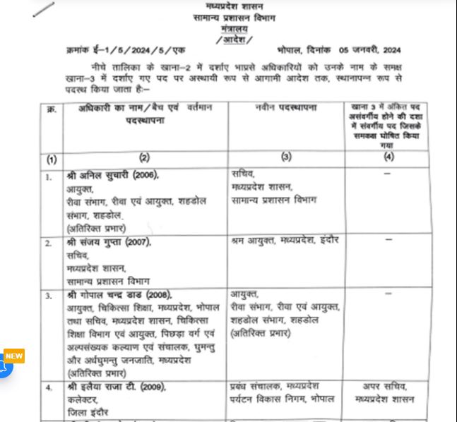 सचिव संजय गुप्ता को श्रम आयुक्त बनाया गया है जबकि रीवा संभाग आयुक्त अनिल सुचारी को सामान्य प्रशासन विभाग का सचिव बनाया गया है।