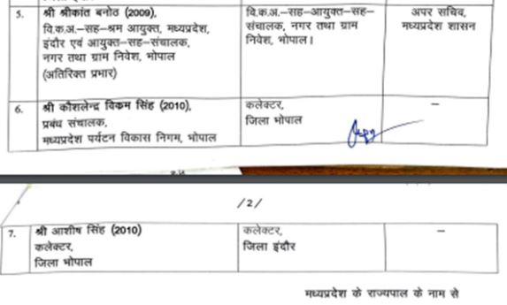 काैशलेंद्र विक्रम सिंह भोपाल और आशीष सिंह इंदौर कलेक्टर बनाए गए
