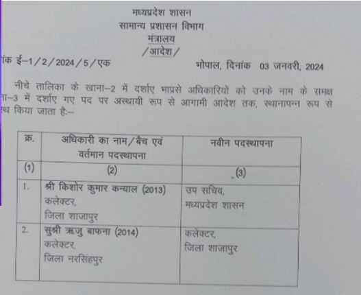 भोपाल । मुख्यमंत्री मोहन यादव ने शाजापुर कलेक्टर किशोर कन्याल को हटाने के निर्देश जारी कर दिए हैं। नरसिंहपुर कलेक्टर ऋजु बाफना को शाजापुर की नई कलेक्टर बनाया गया है। किशोर कन्याल को मंत्रालय में सचिव बनाया गया है।