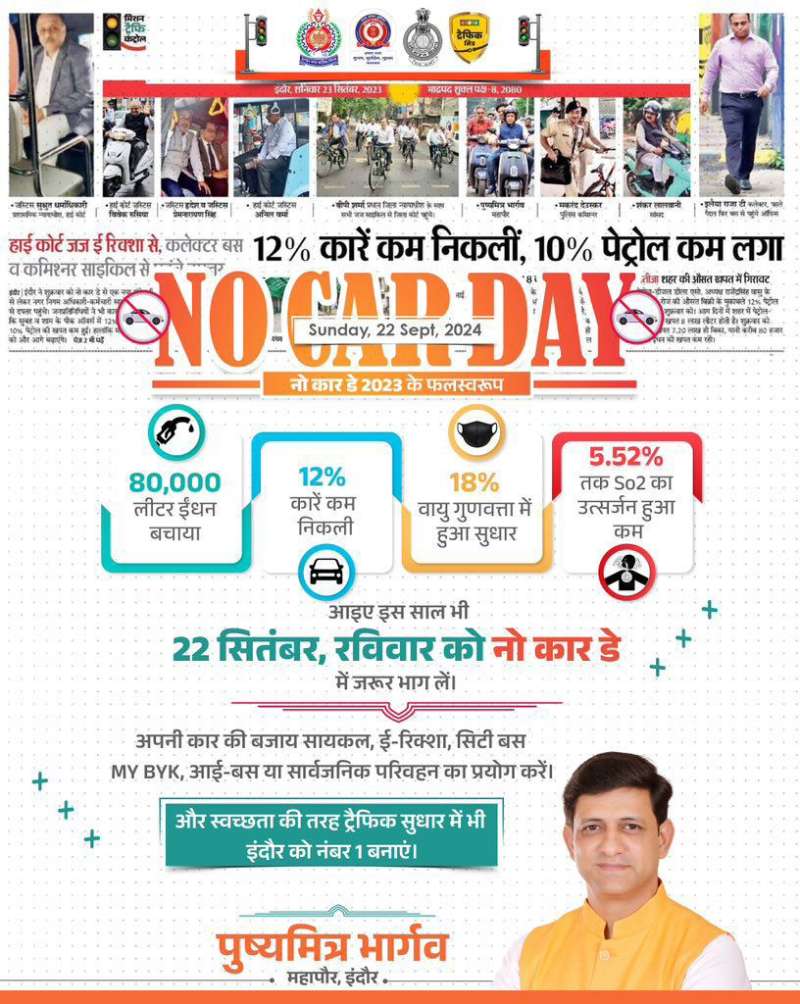 महापौर पुष्यमित्र भार्गव ने इंदौर की जनता से अपील की है, “अब हम स्वच्छता के साथ ही ट्रैफिक सुधार में भी इंदौर को देश का नंबर वन शहर बनाएं। पिछले साल नो कार डे के दिन 12 फीसदी कारें कम निकलीं, हमने 80,000 लीटर ईंधन बचाया, 18 फीसदी वायु प्रदूषण कम हुआ और सल्फर मोनोऑक्साइड गैस का उत्सर्जन 5.5 फीसदी कम हुआ।”