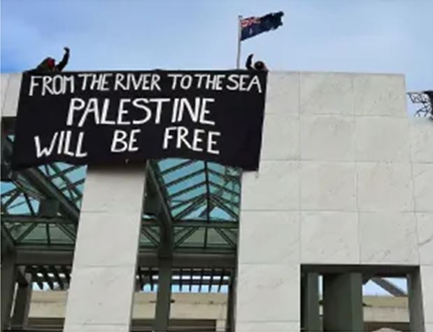 ऑस्ट्रेलिया के कैनबरा में संसद भवन की छत पर फलस्तीन समर्थक प्रदर्शनकारियों ने हंगामा मचाया। गुरुवार सुबह चार फलस्तीन समर्थक प्रदर्शनकारियों का एक समूह संसद भवन की छत पर चढ़ गया, जहां उन्होंने भवन के सामने उन्होंने बैनर टांग दिए। बैनर में सरकार पर युद्ध अपराधों में मिलीभगत का आरोप लगाया गया।छत से उतरने के बाद प्रदर्शनकारियों को ऑस्ट्रेलियाई संघीय पुलिस और ऑस्ट्रेलियाई राजधानी क्षेत्र पुलिस अधिकारियों ने गुरुवार को स्थानीय समयानुसार लगभग 11.45 बजे हिरासत में ले लिया।एक बयान में पुलिस ने पुष्टि की कि तीन पुरुषों और एक महिला को गिरफ्तार किया गया है और उन पर अतिक्रमण के आरोप लगाए जाने की संभावना है। उप प्रधानमंत्री और रक्षा मंत्री रिचर्ड मार्लेस ने संसद भवन के अंदर एक प्रेस कॉन्फ्रेंस में कहा, "इस तरह का कोई भी विरोध प्रदर्शन करने की यहां कोई जगह नहीं है जो दूसरों को खतरे में डालता हो, ऐसा कोई विरोध प्रदर्शन करने की जगह नहीं है जो सार्वजनिक संस्थानों या सार्वजनिक भवनों को प्रभावित करता हो।"