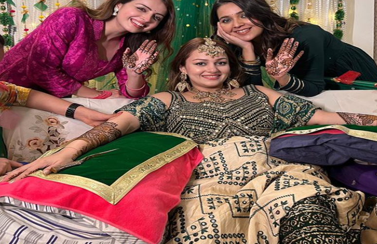 इश्कबाद में नेहा लक्ष्मी के साथ काम कर चुकीं श्रेणु पारिख ने इंस्टाग्राम अकाउंट पर अभिनेत्री की मेहंदी सेरेमनी की तस्वीरें शेयर की हैं। फोटोज में होने वाली दुल्हन नेहा और ब्राइड्समेड्स मानसी-श्रेणु अपने हाथ में लगी मेहंदी को फ्लॉन्ट कर रही हैं। ग्रीन और गोल्डन कलर की ड्रेस में होने वाली दुल्हन बहुत खूबसूरत लग रही हैं। उन्होंने हैवी ज्वेलरी से अपने लुक को पूरा किया।
